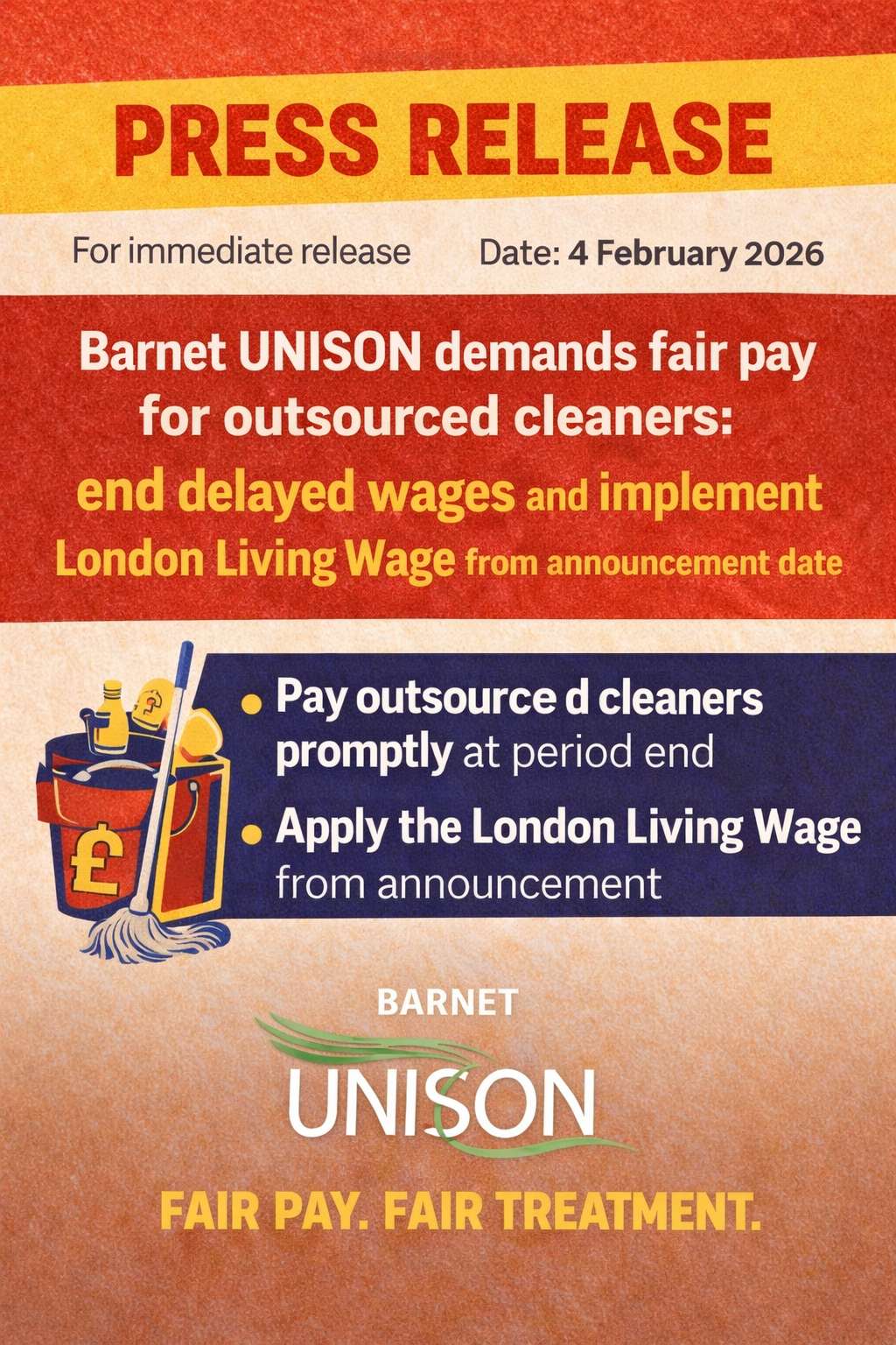 PRESS RELEASE: Barnet UNISON demands fair pay for outsourced cleaners: end delayed wages and implement London Living Wage from announcement date